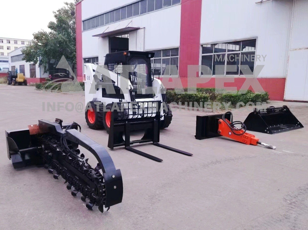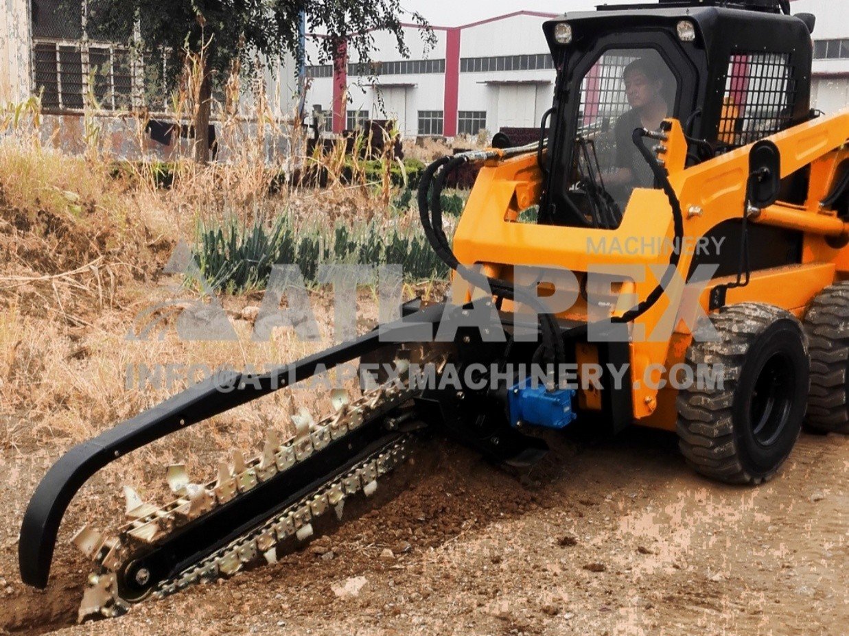 Погрузчик с бортовым поворотом ATLAPEX с траншеекопателем — это инструмент для рытья узких и глубоких подземных траншей в инженерных проектах, подходящий для прокладки кабелей и трубопроводов, а также для рытья траншей для внесения удобрений, дренажа и орошения в садах, огородах и других сельскохозяйственных угодьях.